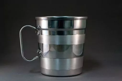 Caneca prateada de duas alças, para fazer a lavagem das mãos. com listas foscas e brilhantes.