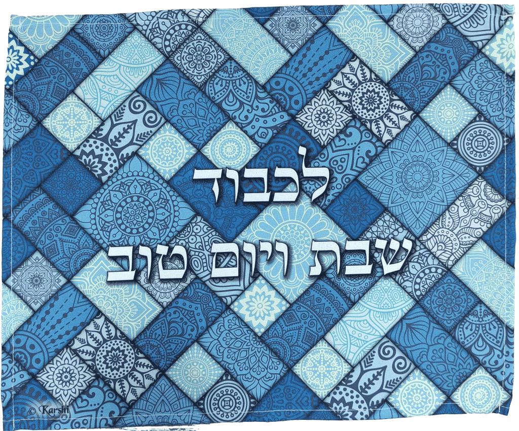 Adicione um toque sofisticado e significativo à sua mesa de Shabat com esta capa de chalá, projetada com uma impressão digital de decoração étnica completa em tons de azul e turquesa. A frase "Em Homenagem ao Shabat e Yom Tov" realça a espiritualidade e a beleza da celebração, tornando-a ainda mais especial.