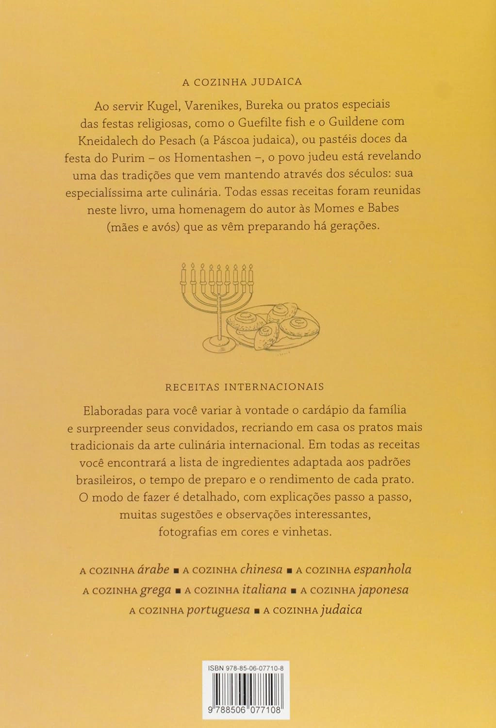 Recrie em casa os pratos mais tradicionais da culinária judaica internacional. Em todas as receitas, você encontrará a lista de ingredientes adaptada aos padrões brasileiros, o tempo de preparo e o rendimento de cada prato. O modo de fazer é detalhado, com explicações passo a passo, muitas sugestões e observações interessantes, assim como fotografias à cores e vinhetas. Acrescente-se a isso o esmerado paladar do autor Breno Lerner.